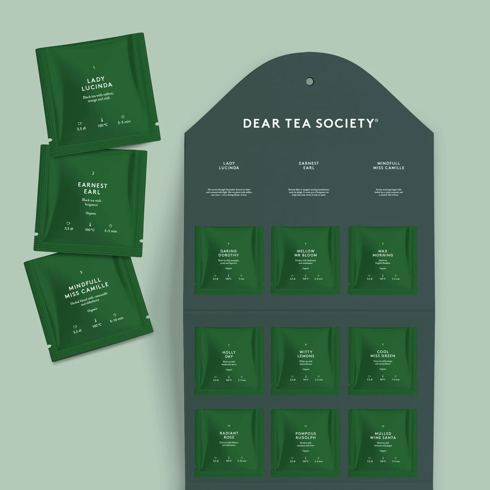 Inside awaits a hanger with 24 numbered tea pyramids, each with its own character and carefully paired brewing instructions. Discover everything from bold black teas to delicate whites, fruity blends, and soothing herbs – a new companion for every tea moment of the season.