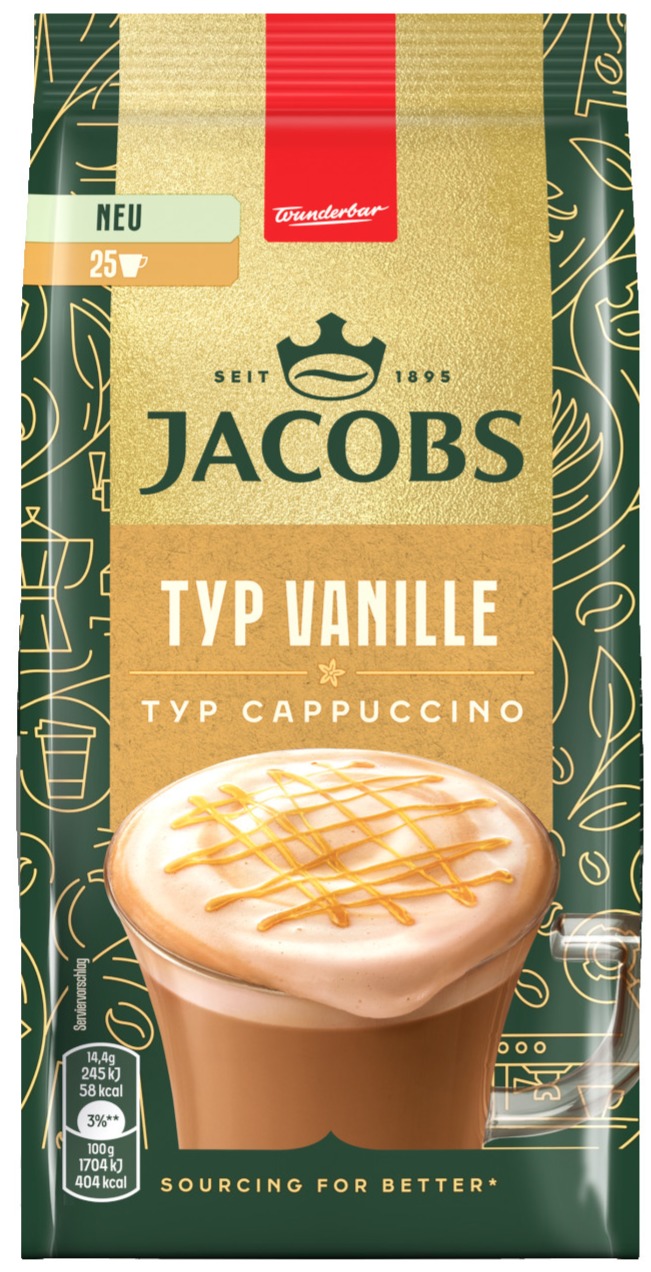 The Jacobs Cappuccino Vanilla is a delicious new addition to the Jacobs Cappuccino range. A smooth blend of fine instant coffee and creamy vanilla flavour creates a truly indulgent taste experience.