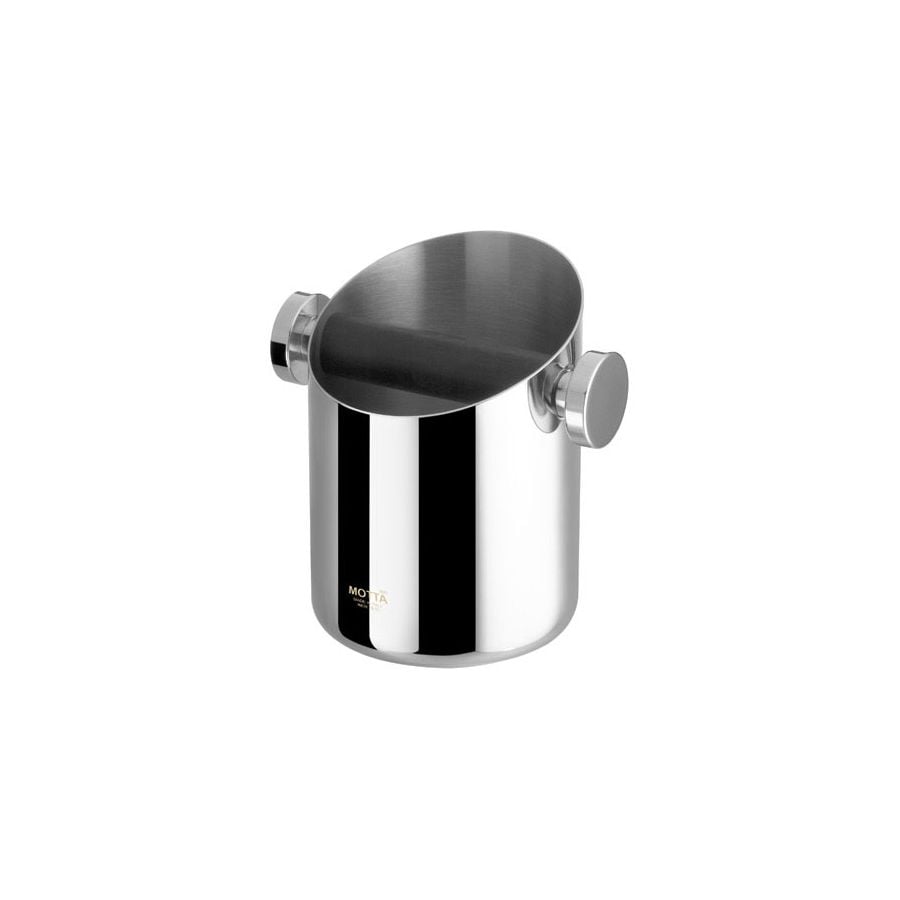 A sturdy knock box from Motta in stainless steel with a diameter of 10.5 cm.