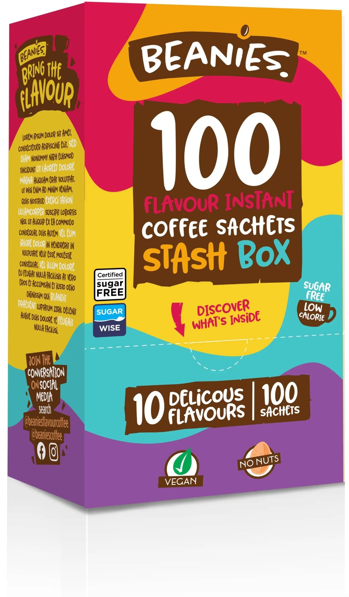 Caja de almacenamiento Beanies con 100 palitos de café instantáneo Beanies llenos de sabor, para que puedas disfrutar de 10 de los sabores más populares en prácticas pequeñas porciones.