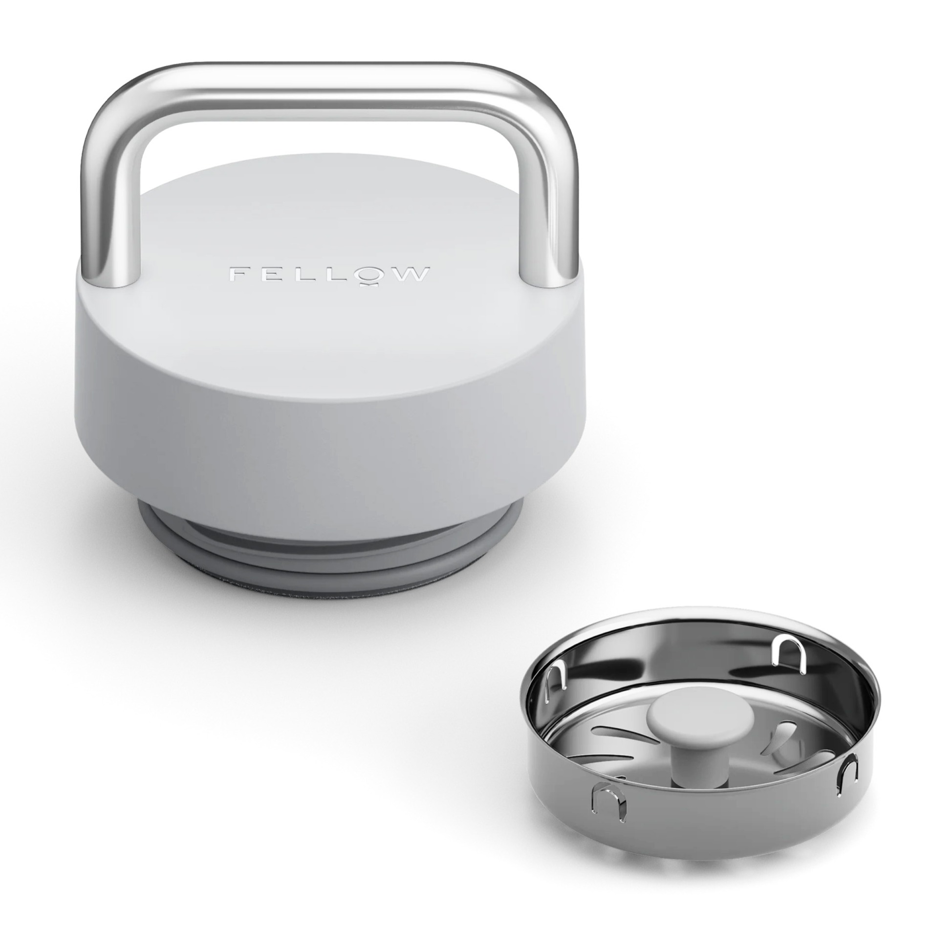 La tapa a prueba de fugas Fellow Carter Carry cuenta con un asa de metal premium para facilitar el transporte e incluye un protector contra salpicaduras encajable.
