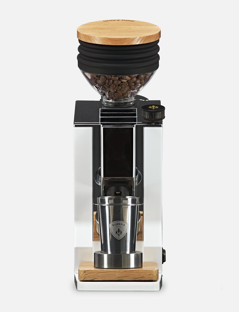 Il macinacaffè Eureka Oro Mignon Single Dose è dotato di un nuovo dosatore singolo con coperchio in legno personalizzato e linguetta metallica girevole (45 g), progettato per soddisfare al meglio i tuoi momenti unici di caffè.