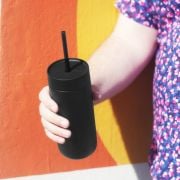 Uma tampa de rosca e um tampão de palha permitem que você beba com segurança sem respingos ou vazamentos.