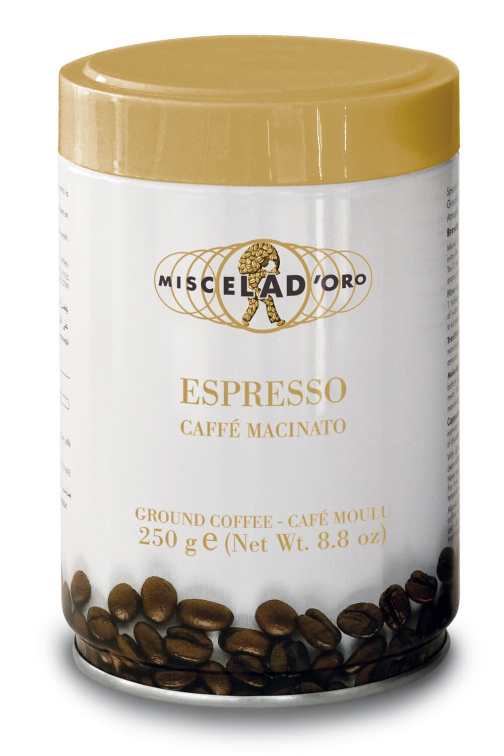 O Espresso Miscela d'Oro está disponível em latas de 250 g, tanto em grãos de café inteiros quanto moídos. O café moído é mais adequado para cafeteiras moka.